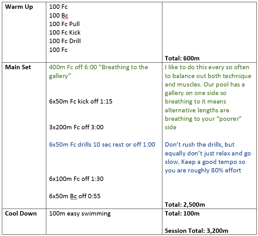 My swimmers enjoy sessions like these where we get a nice aerobic workout with a decent amount of distance covered, but without making it feel like a long slog. The shorter set sizes makes it easier to handle mentally if you are struggling physically. The session is meant to be run straight through without stopping between sets. The times are there as a guide and should be adapted for whatever the swimmer would use for an 80% effort workout. Notes are colour coded for the part they apply to.