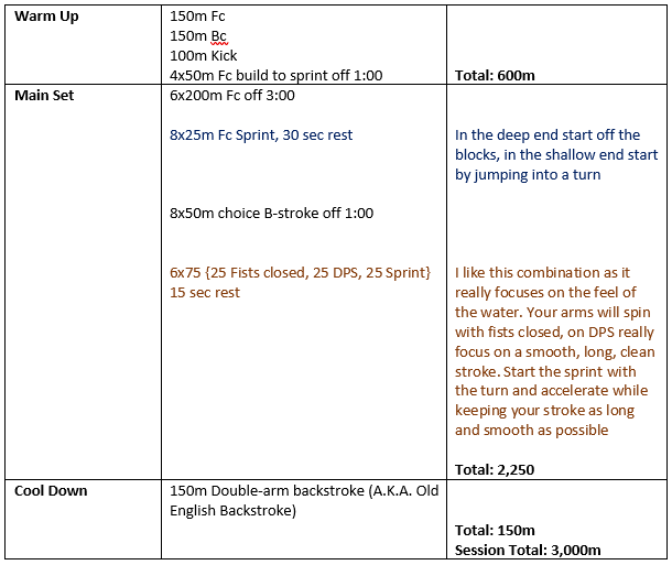 This training session has a nice “solid” bit of aerobic swimming, but also includes some speedwork and even fits in a little bit of other strokes. It never hurts to fit in different strokes or kick into your session, even if it is only a small amount.