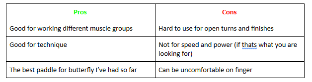 Inside isolation: This is the recommended way to use these paddles and this is really where these paddles shone for me. Unlike the other paddles I was able to use them without needing to change my recovery. They didn’t clip the water on recovery like the agility paddles and they allowed for a smooth clean entry unlike the other paddles I’ve reviewed. I’ll even go so far as to say that out of all the types of paddles I’ve used in the past, these are the best for a butterfly hand entry. I could really feel the catch phase and it allowed me to follow through into the pull.