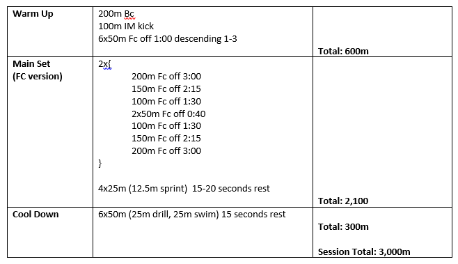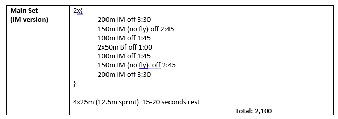 This set is a nice way to get some milage in without being boring. The main set has two rounds and is to be swam straight through. The set is based on 1:30 being the off time for 100m and other times are scalled off that, except for the 50s, they have an extra 5 seconds taken off to give it a bit of a kick. Two versions of the main set are provided, one Frontcrawl and one IM version.