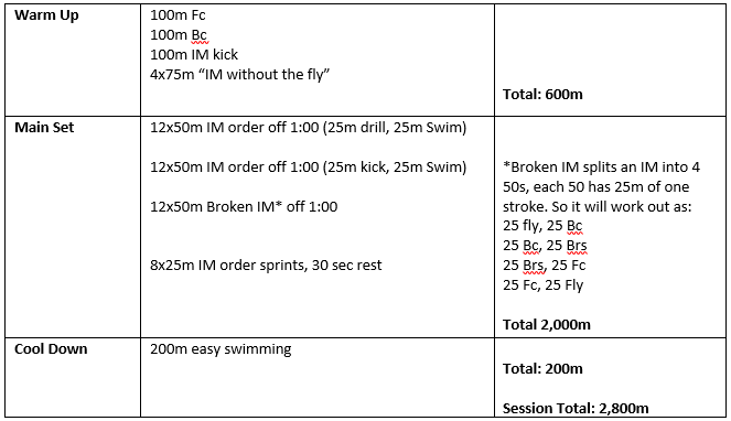 The start of my season is mostly filled with a lot of aerobic frontcrawl, but to stop things getting boring at a time of the year when swimming is a struggle, myself and my sister came up with this session. It was harder than expected, especially the second set of 50s, but I think if we did this again later in the season it would be quite comfortable. One tip before starting a session like this is to make sure you have your drills picked out before you start. We swam this straight through with no breaks between sets.