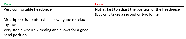 There is nothing odd about getting a snorkel in two pieces if you’re not buying something like the Arena snorkel I reviewed before, but this snorkel came in 3 parts that needed assembly. So from the beginning you know something is different about this snorkel. It isn’t obvious when you look at it online or on it’s own, but the shape of the snorkel is also a little different to the FINIS one. This is really only obvious when the two are side by side. However, the two major differences between this snorkel and others are the headpiece and the mouthpiece.