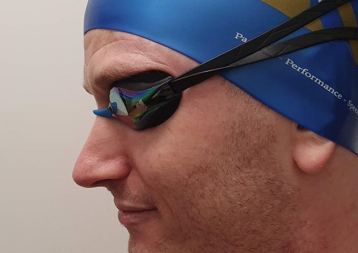 I often comment on goggles having a low profile, but since I’ve tried these goggles and the Arena Cobra Ultra goggles I realise I’m going to have to come up with a new category; super low profile. These things are incredibly small. I’m still surprised every time I look at them from the top or bottom and see how shallow the lenses are. The split lenses are really quite clever. The top of the goggle is narrow and fits in under my brow so that there is less drag between my face and the goggle. They slope out which probably has some hydrodynamic effect, but also makes space for my eyes. Even still my eyelashes sometimes brush against them. Looking at them first, I thought that the split lens would be annoying and disrupt my field of vision. Instead, I find the split is more than halfway down so that I’m always looking out of the top part anyway. While it doesn’t have the same field of vision as the Arena Pythons, they have a wider field than the other goggles I’ve reviewed such as the speedo and zoggs and even the Swedish style goggles. This is partly due to the low profile, usually the side, front and bottom parts of the lenses are what narrows or distorts the field of vision. With these the top and bottom are so small there isn’t much to distort, and while there is more on the sides, there is still less than in others like the Swedish goggles.