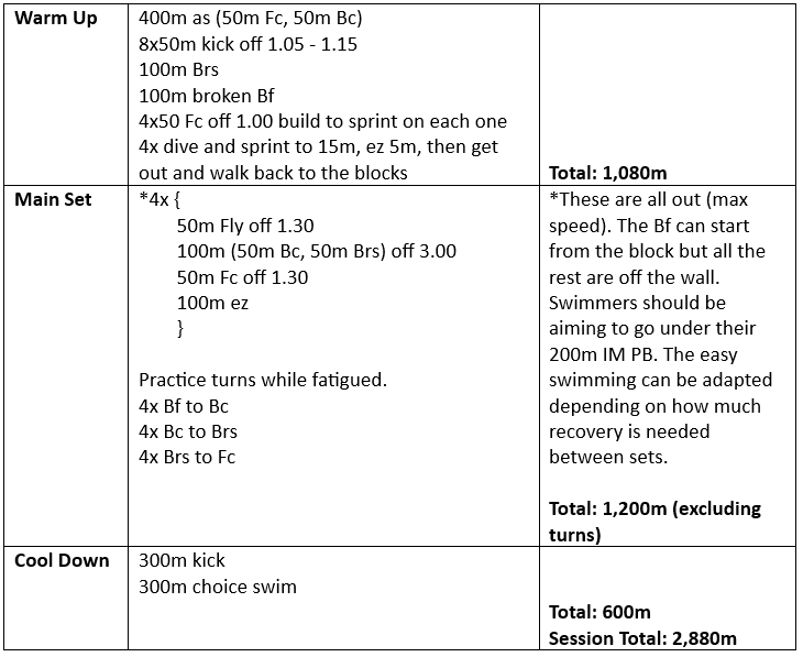 During the regular swim season, I always recommend doing one anaerobic session per week (typically we do this on a Saturday) unless there is a competition. This can be increased if implementing a build cycle. The challenge with having regular anaerobic sessions is keeping it interesting for the swimmers while also targeting specific race skills. In my current coaching role I’m an assistant to the head coach and one of my duties is to come up with the weekly anaerobic session. For this session we wanted to do something new, we wanted it to focus on IM, we only have access to a 50m pool, and we wanted to have the swimmers do change-over turns while fatigued and under pressure. So, an IM version of the classic or the nauseator was out, and we could hardly expect the swimmers to go all out and sprint 200s IM. Instead, we came up with this main set. Our reasoning was that it would cover the trickiest turn (backstroke to breaststroke) and the swimmers could go all out for the fly without fear. My personal training went off the rails recently so this is the only anaerobic session on here that I have not done myself, but we were really happy with the results when the squad did it.